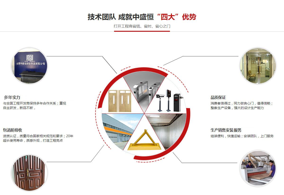 山西中盛恒安防談?wù)劮阑鹁砗?..山西中盛恒安防科技有限公司成立于2010年,地處人杰地靈的山西省省會(huì)——太原市,公司注冊資金200萬元人民幣,從事自動(dòng)旋轉(zhuǎn)門、伸縮門、卷簾門、車庫門、工業(yè)門、防火門、防爆門、防盜門、智能樓宇系統(tǒng)及建筑幕墻、門窗、綜合裝飾工程,是集科研開發(fā)、設(shè)計(jì)、施工、售后服務(wù)于一體的綜合性股份制企業(yè)。
